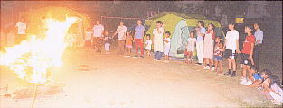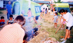 だんだんと辺りも薄暗くなってきて飯ごうのごはんもいい具合に炊けてきて、みんなで作ったおいしいカレーライスを食べました。 テントの中に入って友達とたのしいおしゃべりをしながらの夕ご飯。 みんな何杯もおかわりをしていました。 ごはんが終わってからも楽しいことがいっぱい。 スイカ割り、キャンプファイヤー、花火・・・キャンプファイヤーの時には、うたをうたったり、お母さん達がダンスも披露してくれてみんな大喜び。 いつのまにか空には星がいっぱい。流れ星もみえたんですよ。 パジャマに着替えてからは部屋を真っ暗にして映画大会。 でもこの時ぐらいからうつらうつらしている子が何人か・・・おふとんに入ってしばらくはぺちゃくちゃおしゃべりしていた子もいつのまにかグーグー。