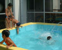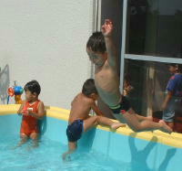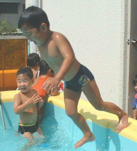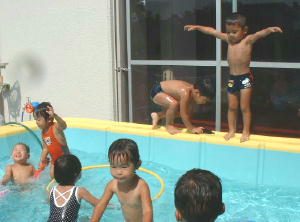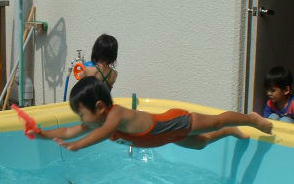 | メロン組 プールもいよいよ終わり。 2歳児メロン組、 3歳になった4人の子が 頭からの飛び込みが できるようになりました。 (9月1日UP) |