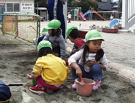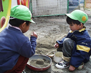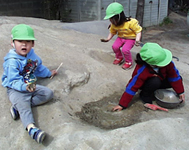 | それと、砂遊びも大好き。 いろんな型抜きをしたり、「先生、ケーキができたから食べよ。」と誘ってくれたり。 おいしそうなご飯がたくさんできています。 砂運びの名人!?もいますよ。手押し一輪車を押して、あちらこちらと。。。 |