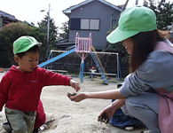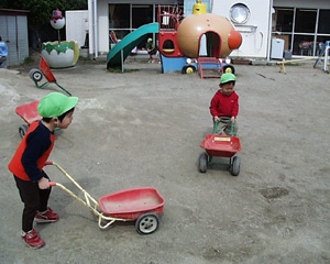 工事ごっこが大好きなチェリーさん。 砂場に大きな穴を掘ったり、川を作ったり毎日楽しそうに遊んでいます。 「島ができたよ!」 「お水を流して川にするぞ!」 「おっ!つながった!!」 どの子もみんな生き生きした表情に声♪ 土を運んだり、水を汲んできたり、それぞれの役割も決まってるみたい。。。 大きなスコップと手押し車(一輪車)が特に人気! 出来上がった大きな砂場アート。。芸術作品だねぇ、これは! ある日のお昼寝前。。。 雨がポツリ、ポツリと降ってきた。。。 「あぁ〜どうしよ?壊れる!」心配でなかなかお昼寝に行けない。 そしたらある子が「大丈夫!川が雨で大きくなるよ、きっと!」 なるほど、その言葉に救われてみんな安心して眠りに就いた。。。 今ごろお砂運んでる夢でもみてるのかなぁ。。♪ ![]() ![]() お弁当持ってピクニックに行きました。 その日は朝から雨だというのに、お部屋では空っぽのお弁当箱の品評会と、シートの展示会?! 室内で遠足ごっこが始まる。 「雨が降ったらどこで食べるの?!」 心配そう、、、もちろん、雨が降っても園舎の中のあちこちでお弁当開きを始めるんだろうけど。。 お弁当を詰め始めた10時半ごろ。 天気予報通りに段々お天気がよくなる。。。って。 ![]() やっぱりそうだったねっ☆。.:*:・'゜★ 予定通りにお弁当を持って日枝神社へ行くことができたよ。 あちこちで楽しそうにお弁当を広げながら笑顔も満開! 春にやって来たときよりは随分しっかりしてきたかな。 お弁当を食べる時間も短くなってたくさん遊べたよ。 かくれんぼ、探検ごっこ、ぶらんこ、シーソー・・・ 楽しいひとときを過ごして帰ってきました。 また行きたいねっ☆。.:*:・'゜★ (10月24日UP) |
